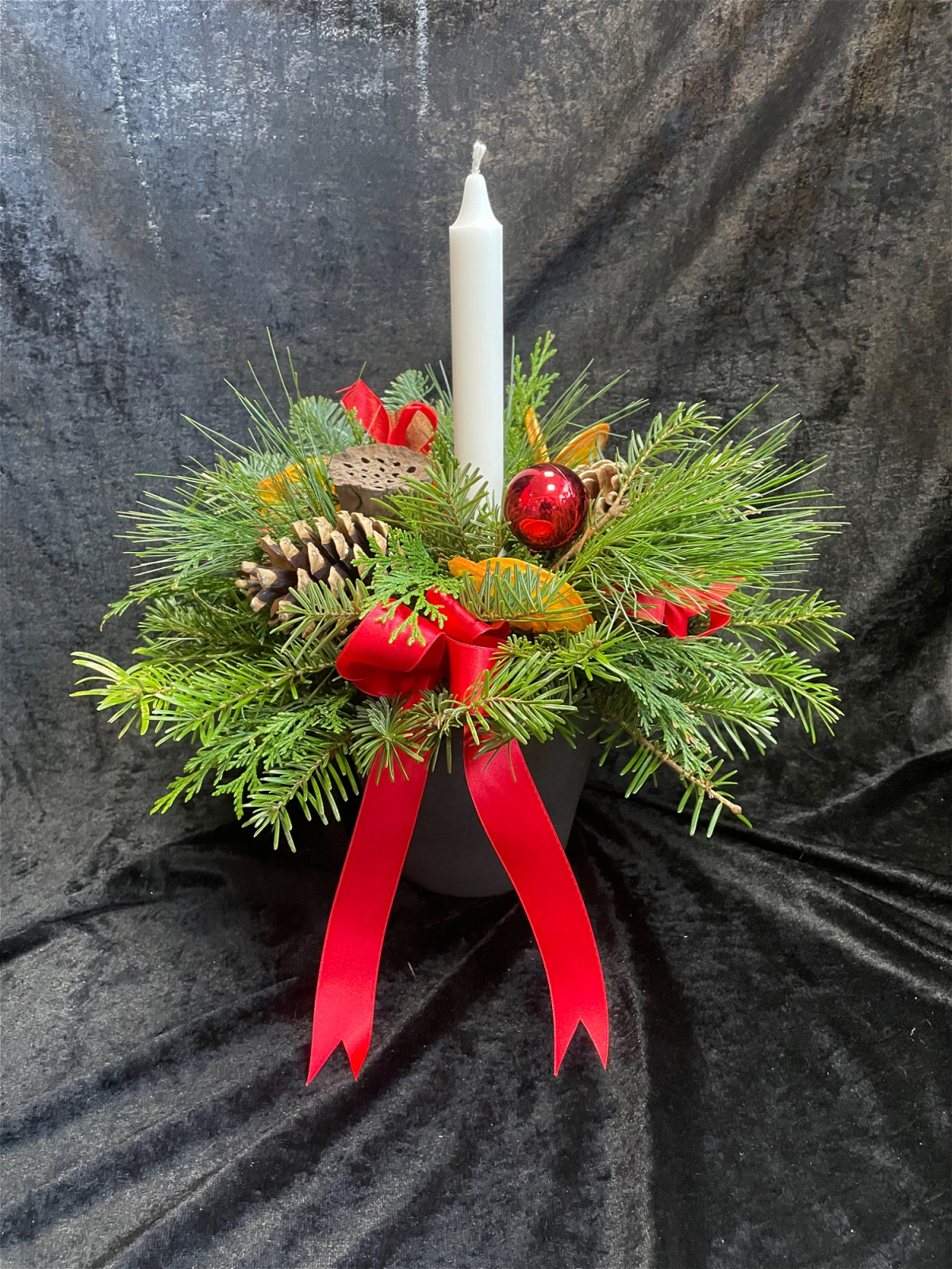 A beautiful luxurious festive arrangement, packed full of seasonal foliage and adornments, all made in a reusable ceramic container.