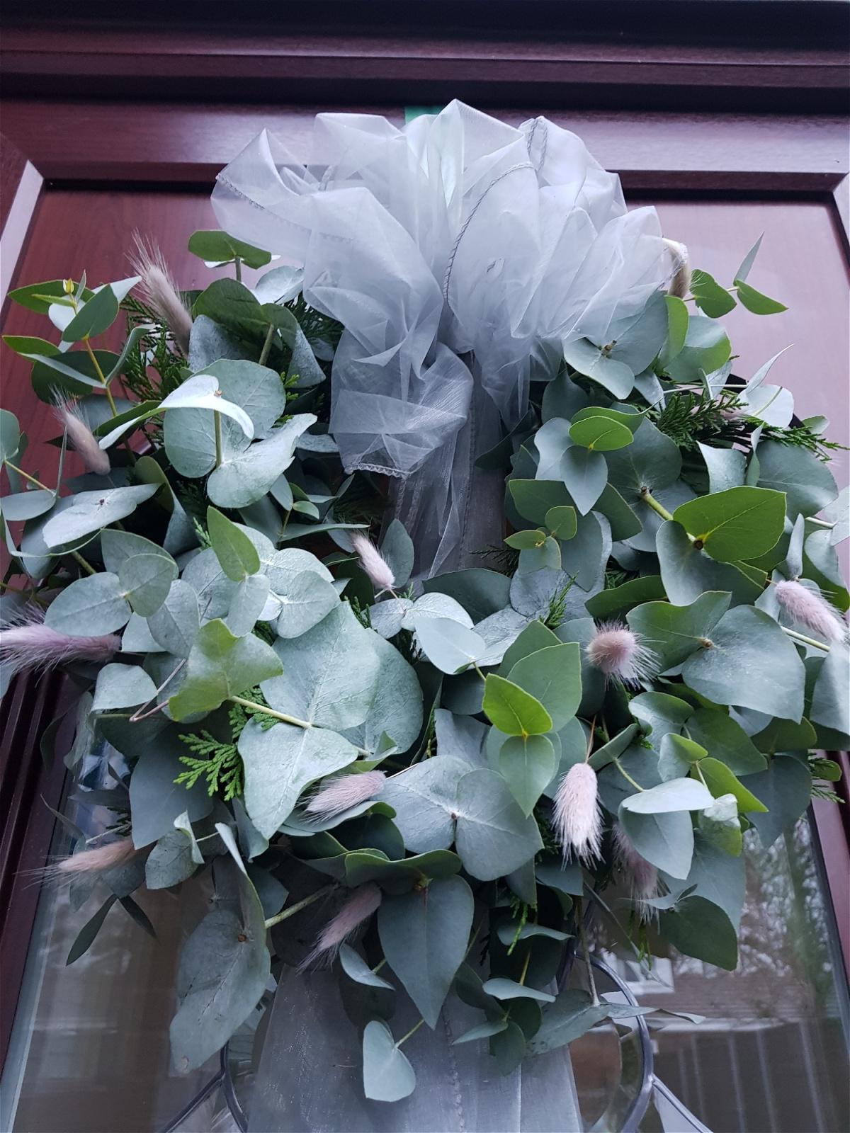 Our handmade Fresh Eucalyptus wreath also including seasonal foliage and fluffy bunny tails!